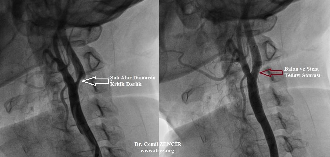 Şah damarında oluşan bu daralmalar ani görme kaybı, konuşma bozukluğu, kol ya da bacaklarda hareket kaybına neden olabilir. Tanı için fizik muayenede boyunda üfürüm duyulması, ultrason, MR ile yapılan anjiyografi ve bilgisayarlı tomografik anjiyografi yapılabilir. Kesin sonuç için kateterle yapılan anjiyografi işlemi gerekebilir..